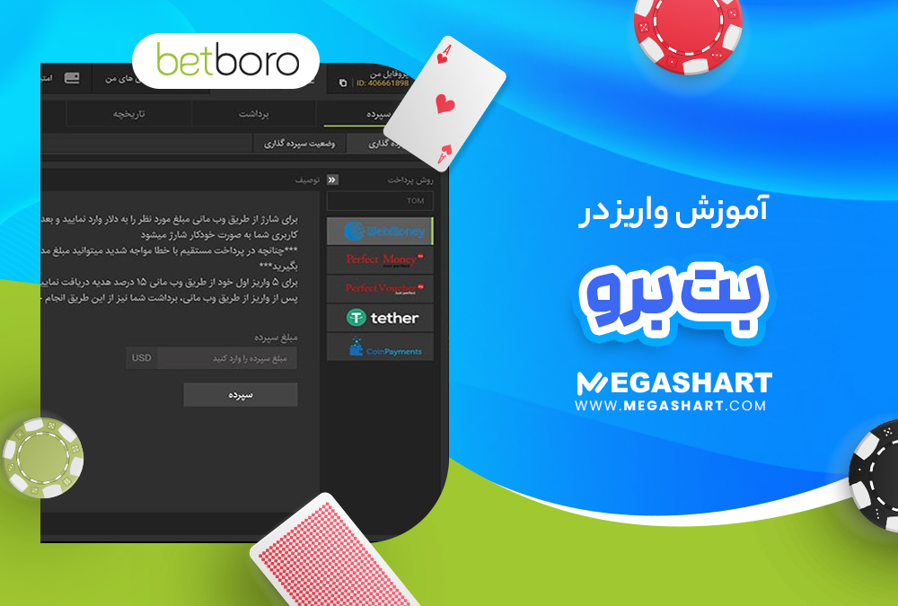 این پست درباره آموزش واریز در بت برو BetBoro است. سایت شرط بندی بت برو یکی از بهترین گزینه برای شرط بندی است که در این پست همانند جت بت توضیح می دهیم که چگونه حساب کاربری خود را شارژ کنید تا دچار سردرگمی نشوید. با ادامه این پست با سایت مگاشرط همراه باشید.